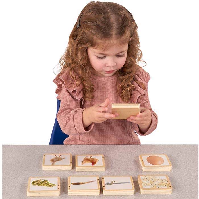 These self-correcting tiles feature real photographs and show 4 life stages of humans, bees, frogs, apples, butterflies and chickens. A great tool for early literacy, science and observation.