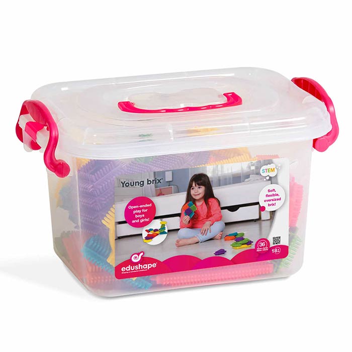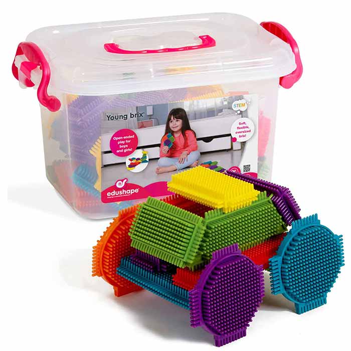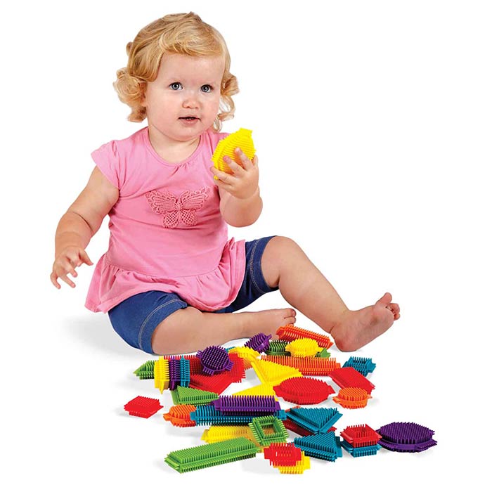 These soft and flexible bristle blocks come in nine different shapes. The brix easily interlock and are ideal for open-ended and constructive play. The set features oversized pieces designed for small hands to easily manipulate.