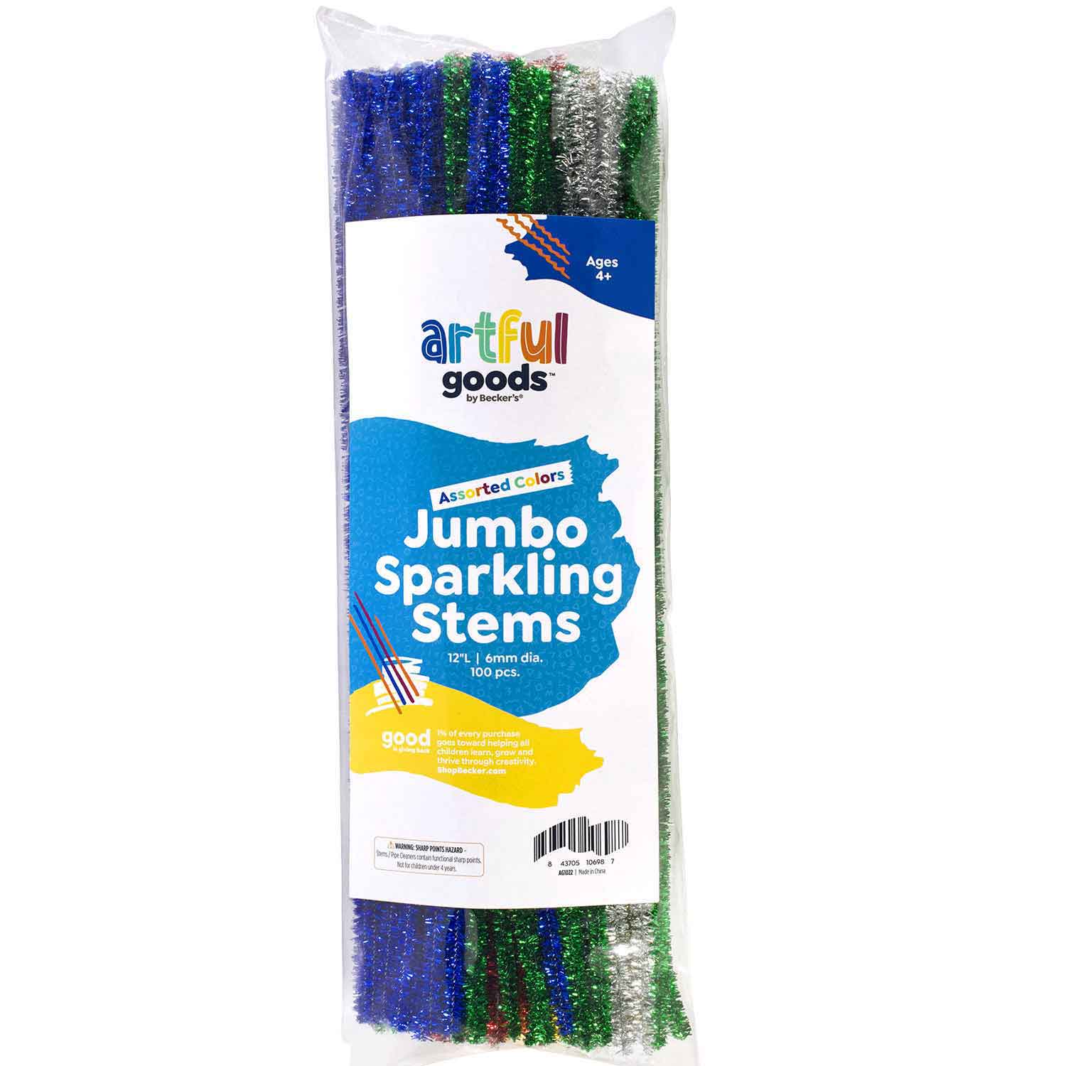 Artful Goods® Sparkling Jumbo Stems are bunches of fun for young crafters. Made in assorted sparkling colors, children can practice their fine motor skills while they shape jumbo stems into unique creations. 6MM thick, 12" long, 100 piece pack creates hours of fun.