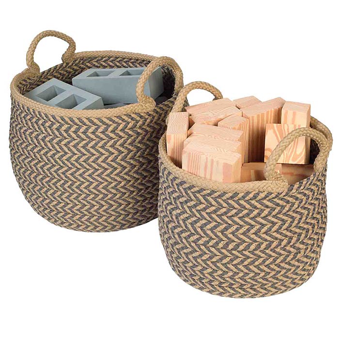 This stylish set of 2 woven baskets with a grey and tan chevron pattern will enhance any classroom, office, or lobby decor.