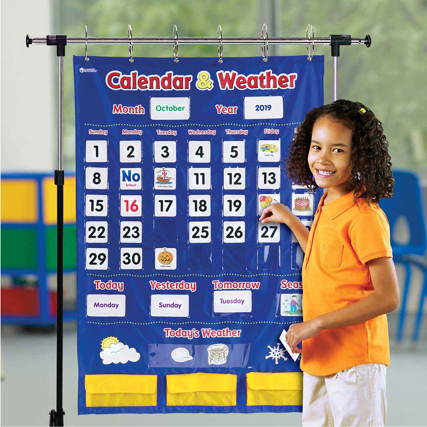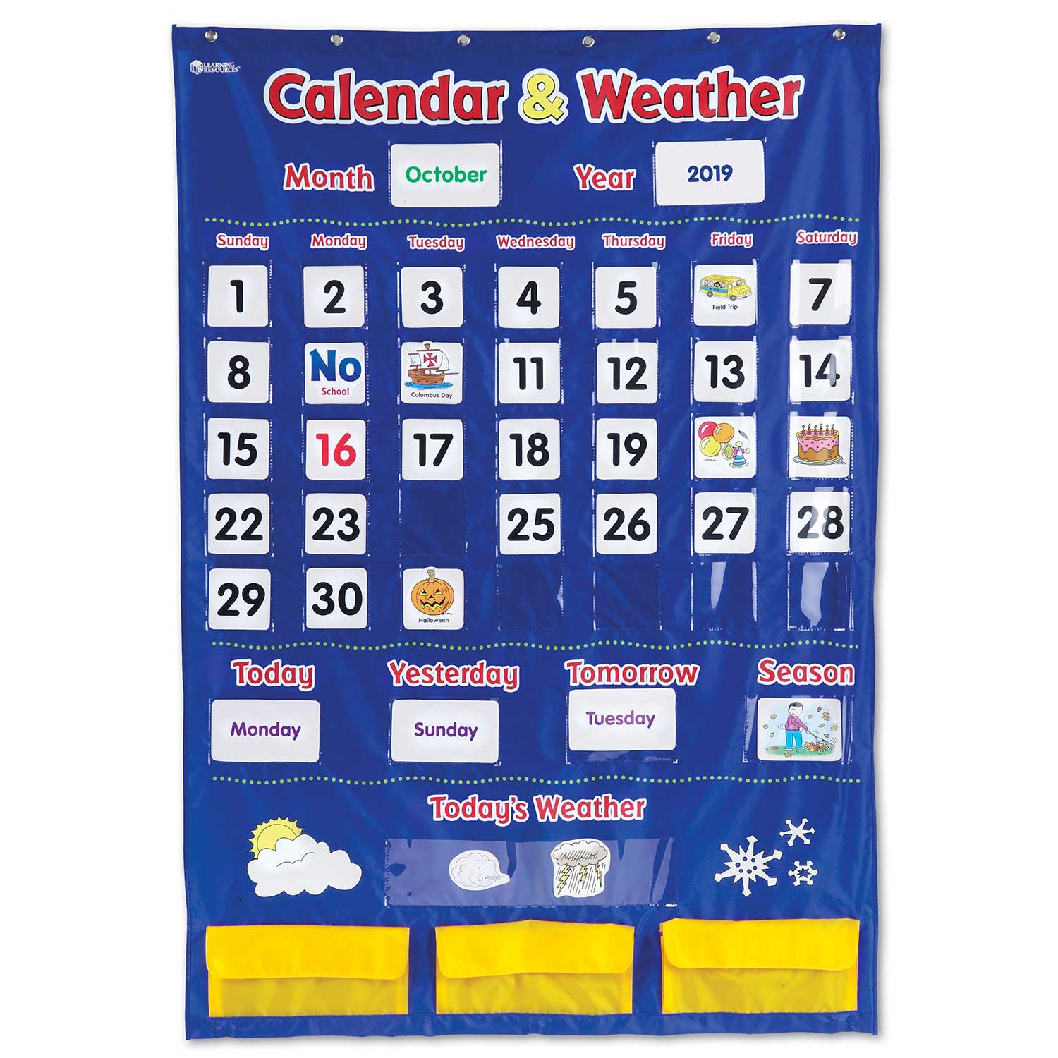 - Includes pockets and a total of 136 pre-printed, double-sided cards for dates, days of the week, months, years, yesterday, today, tomorrow, holidays and celebrations, weather conditions and seasons