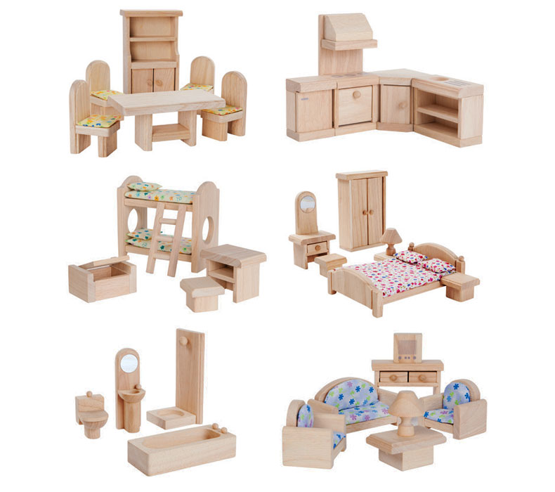 These furniture pieces are crafted from sustainable rubberwood and include all the necessary furnishings and accessories to stimulate complex play experiences. Furnish the whole house: kitchen, living room, dining room, 2 bedrooms, and bathroom.