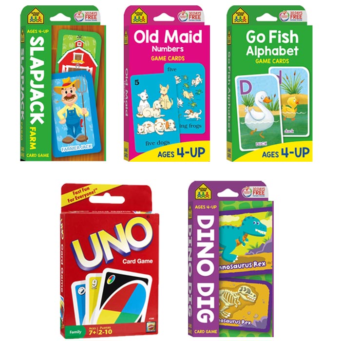 A freshly updated version of classic children's card games. Set of 5 includes Old Maid, Go Fish, Uno, Crazy Eights, and Slap Jack Farm.
