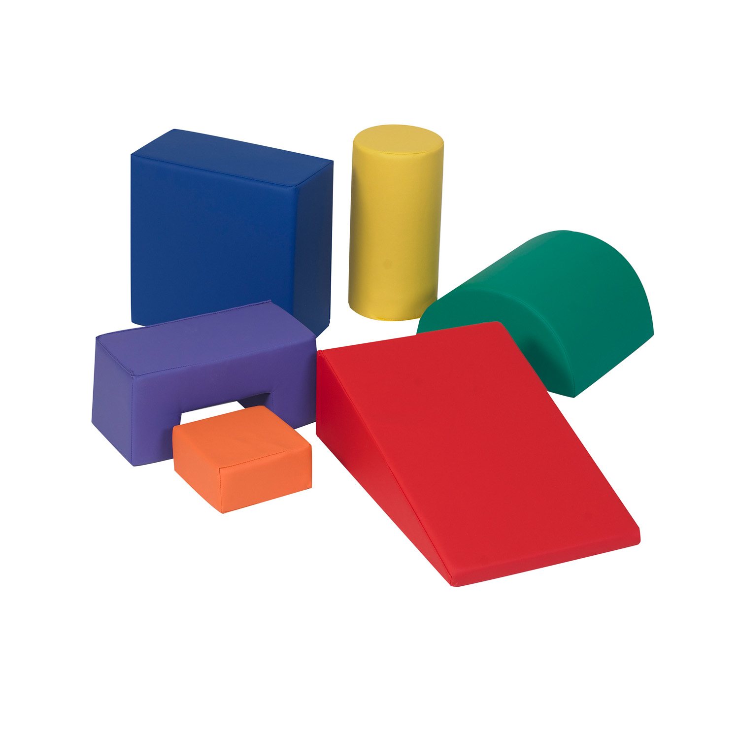 These shapes allow for a variety of setup options to keep playtime interesting! The sturdy foam shapes are covered in an environmentally friendly polyurethane that is easy to wipe clean and disinfect. Includes a large and small square, a rectangle with cut out, ramp, cylinder, and half-moon.