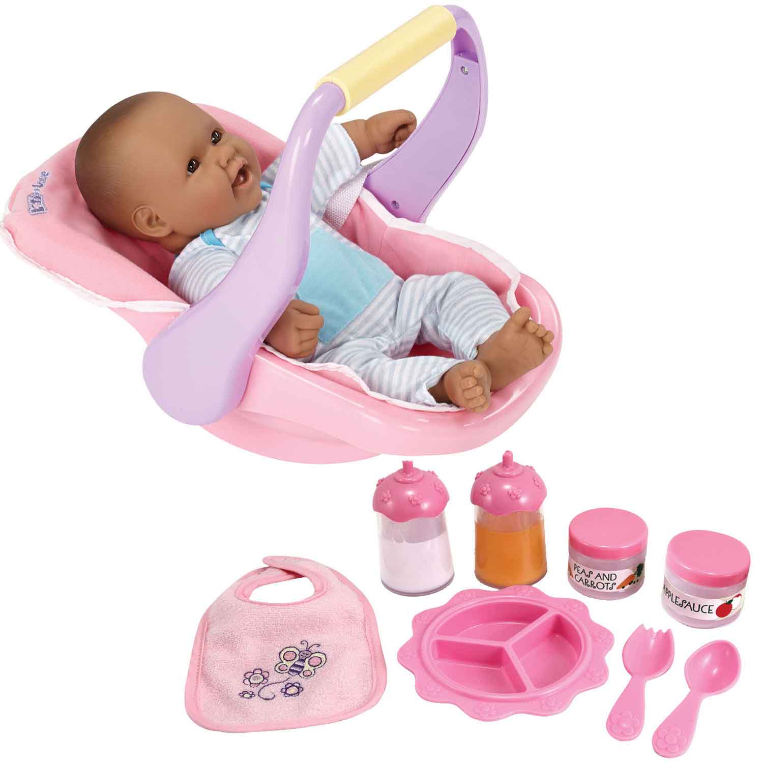 This doll care accessory play set will amuse little caregivers for hours. Includes doll carrier and feeding set. The doll carrier holds a doll up to 16”. Feeding set includes big, divided dish, utensils, food and bottles. Dolls sold separately.