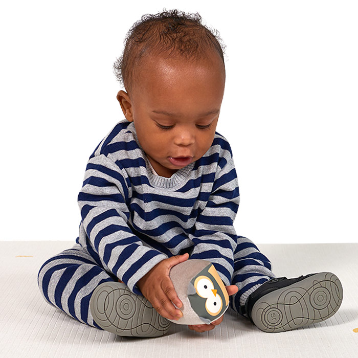 Farm Friends Roly Poly Balls is a set of 4 adorable and fun farm animals to amuse infants as they begin to develop fine motor, tactile, and hand-eye coordination skills. The round shape and soft contrasting textures make the balls easy to grasp as infants explore their early sensory skills and shake the balls to hear the different bells inside each one. Set includes a sheep, owl, fox, and dog.