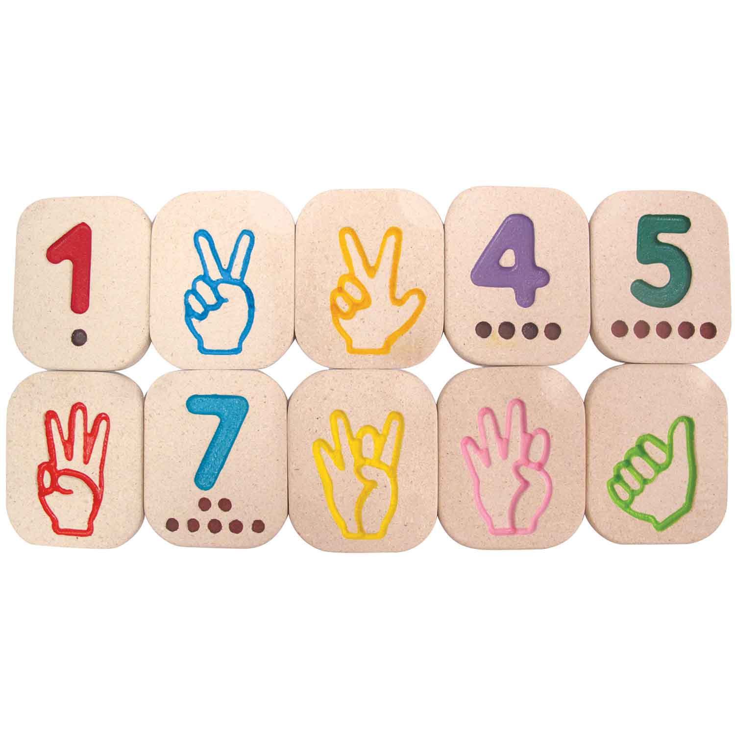 Beautifully crafted wooden shapes for tactile learning. One side has deep impressions for numbers and counting dots and the reverse side shows the matching American Sign Language symbol.