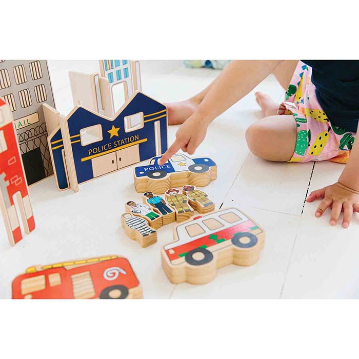 This play set represents the world of emergency services and includes a police station, fire station, jail and hospital as well as wooden figurines and vehicles to go along with them. Birch plywood pieces easily slot together with pre-cut grooves.
