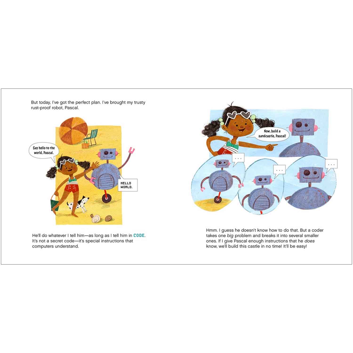 All summer, Pearl has been trying to build the perfect sandcastle, but out-of-control Frisbees and mischievous puppies keep getting in the way! Pearl and her robot friend Pascal have one last chance, and this time, they’re going to use code to get the job done. Using fundamental computer coding concepts like sequences and loops, Pearl and Pascal are able to break down their sandcastle problem into small, manageable steps. If they can create working code, this could turn out to be the best beach day ever!