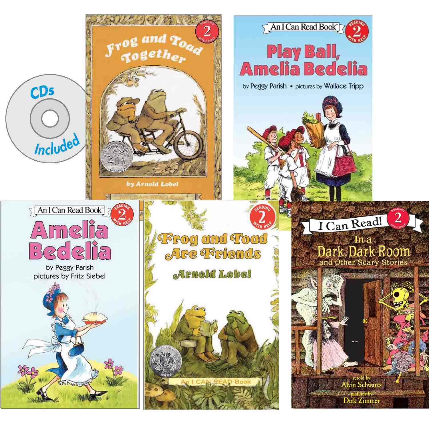 This I Can Read Book Set includes Level 2 reading books along with story CDs. Level 2 books feature longer plots with more advanced vocabulary. These books are perfect for children who are in the beginning stages of learning to read on their own. The books included in this book set are: Amelia Bedelia, Frog and Toad All Year, In a Dark, Dark Room, Frog and Toad Are Friends, and Play Ball, Amelia Bedelia.