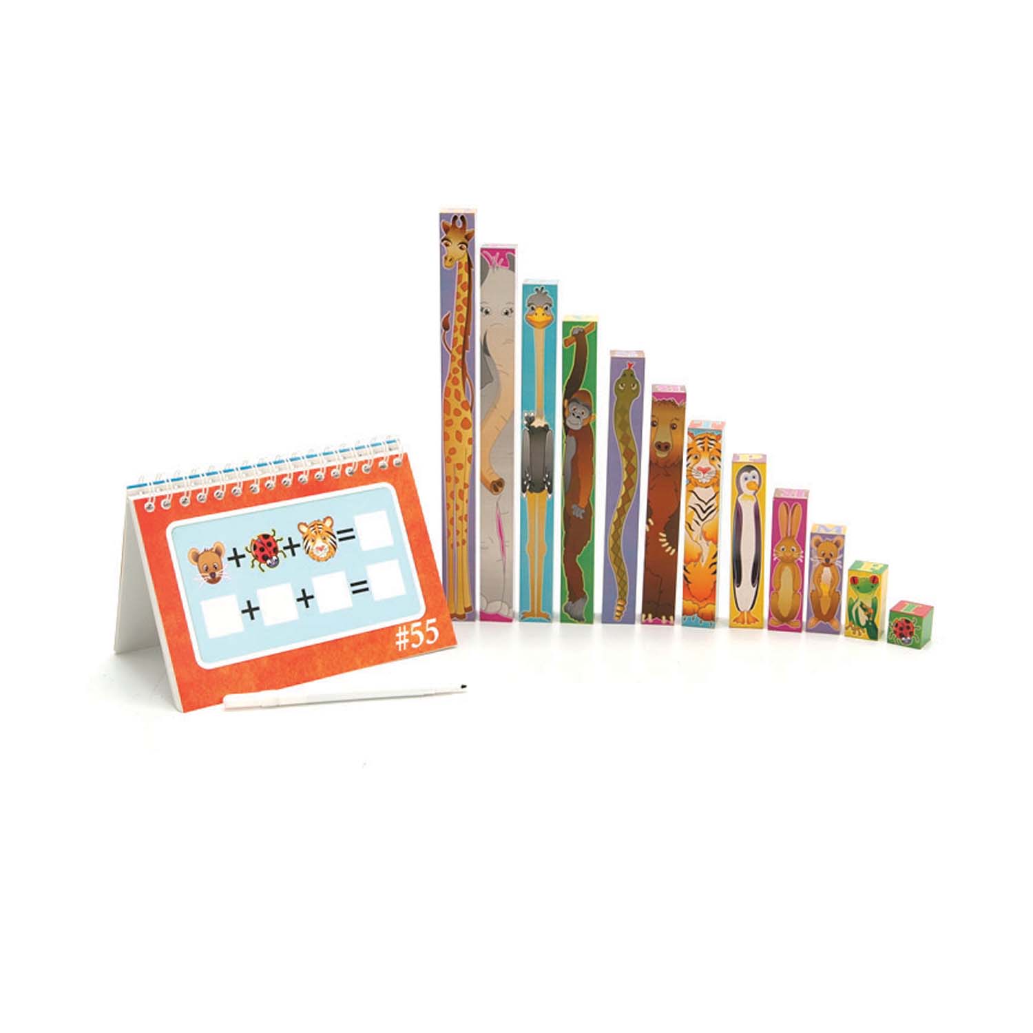 Inchimals are incredibly effective math blocks that teach measurement, number concept, addition, subtraction, and pre-algebra! Colorfully crafted and thoughtfully designed, Inchimals include 12 wooden animal blocks measuring 1" (the tiny ladybug) to 12" (the towering giraffe) and a write-on - wipe off activity book. With exact inch segments, written numerals, representative dots, and cute animals , this set develops math concepts and builds a strong math vocabulary.