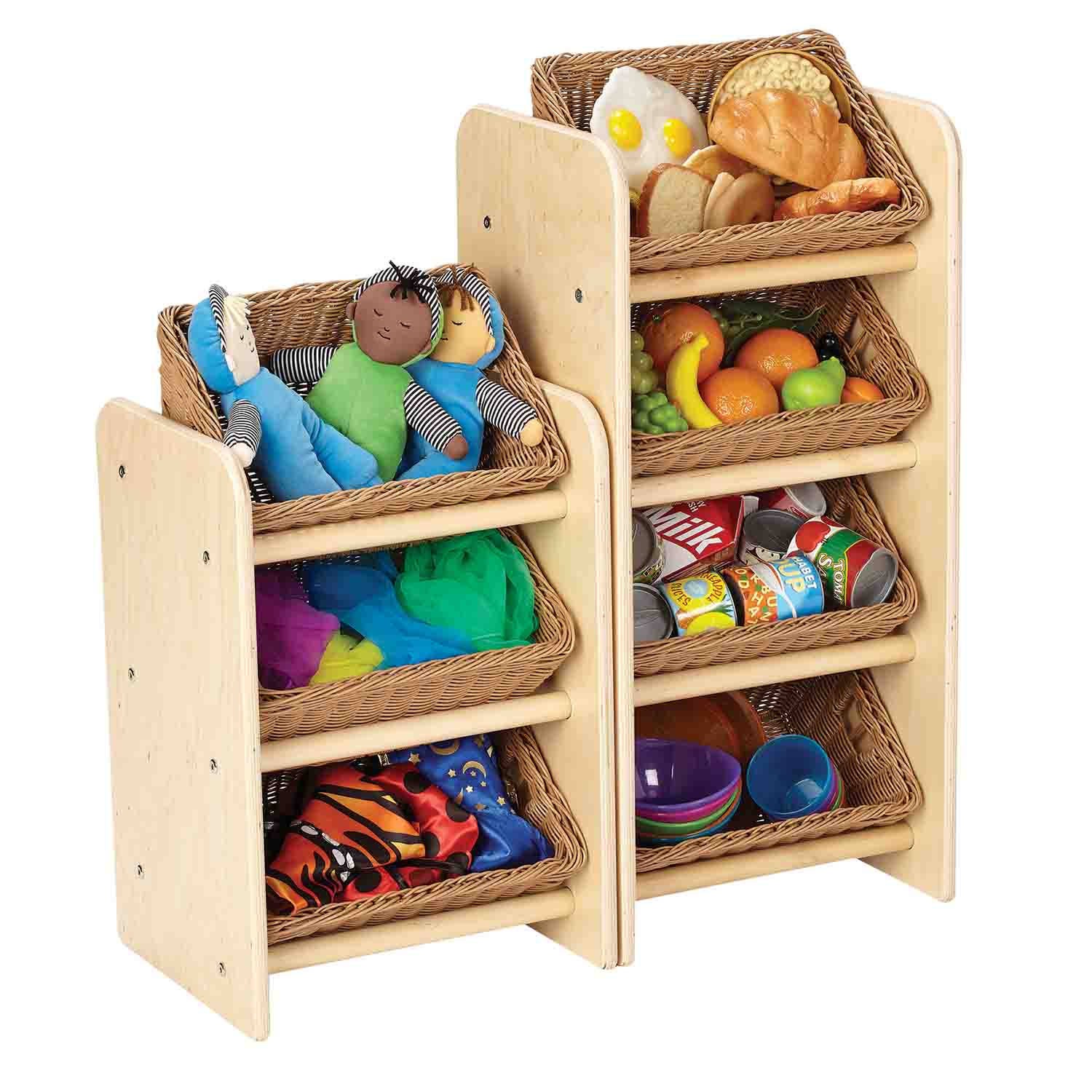 These great looking shelving units can fit anywhere and help keep your learning centers organized. The attractive and durable plastic baskets are removable and provide ample storage for your manipulatives, dramatic play props, art supplies, and more!