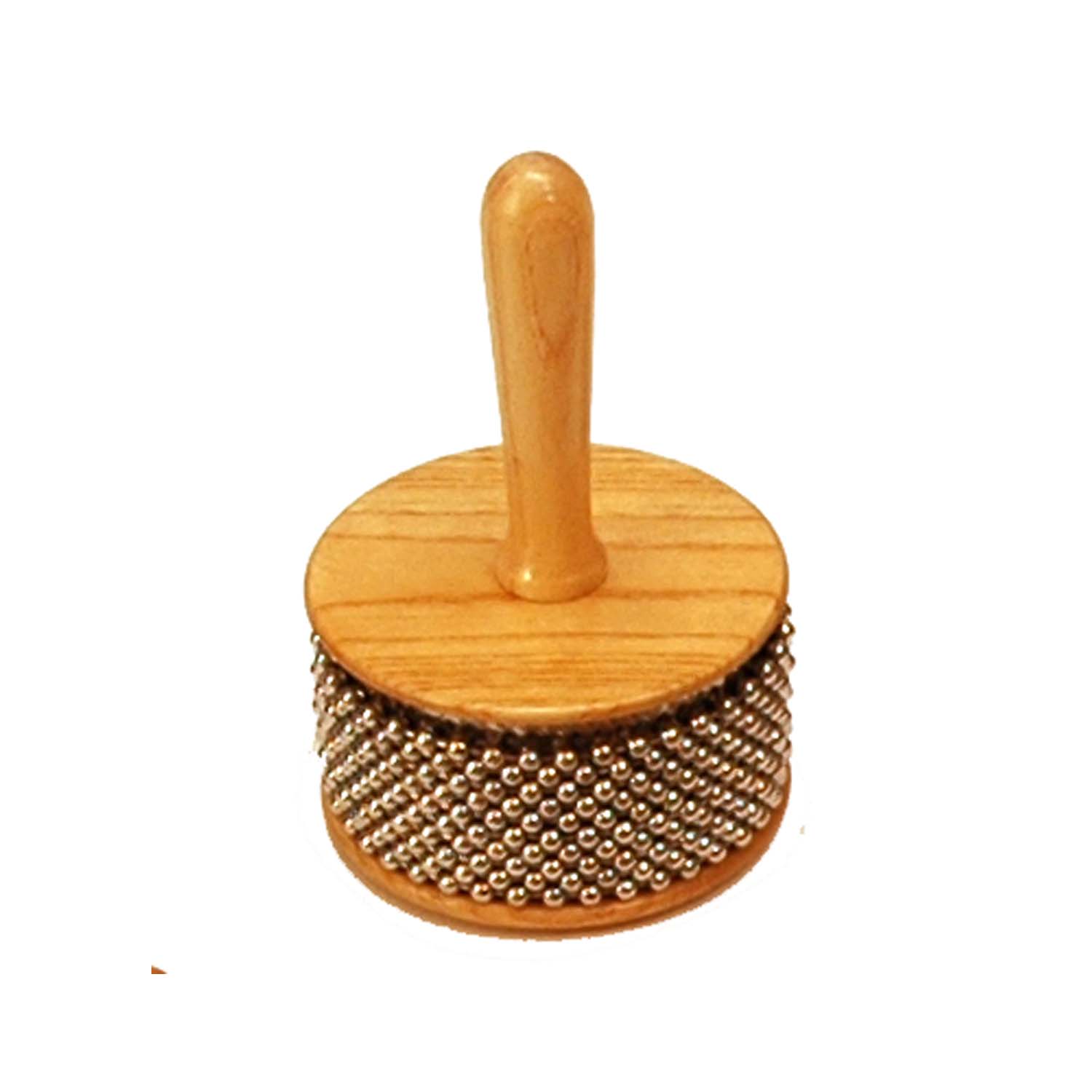 A ridged stainless steel shell surrounded by loops of steel-bead chains. Wooden flanges enclose the cylinder with a wooden handle attached to the bottom. Produces rhythmic shaking and rattling sounds by either turning or shaking.