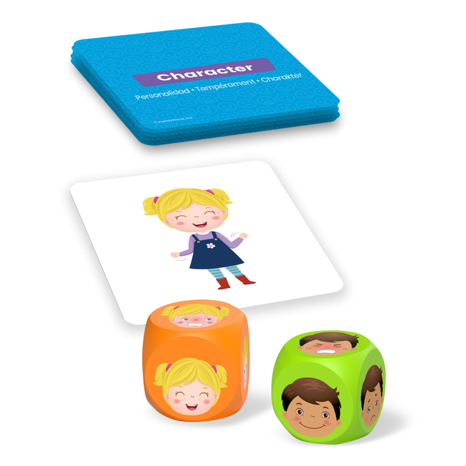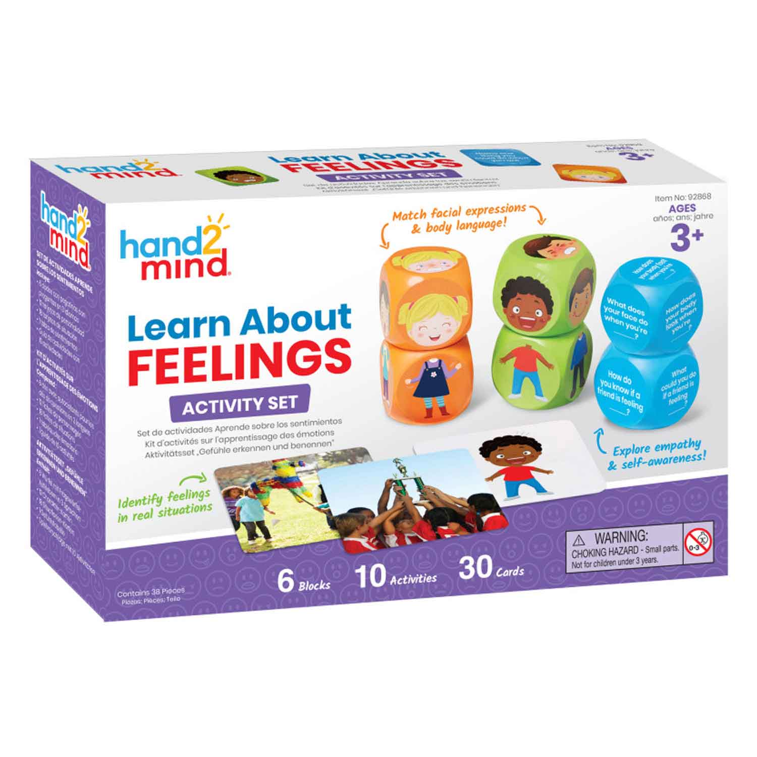 Explore feelings and practice social-emotional skills with this set of 10 engaging activities. Children match body postures and facial expressions, learn that emotions can look different on different people, and discuss how situations may cause someone to feel a certain emotion. Includes 6 plastic cubes (2 question and 4 character), 12 character cards, 18 situation cards, and 1 poster.