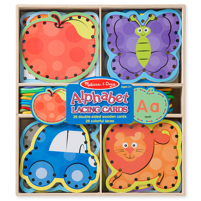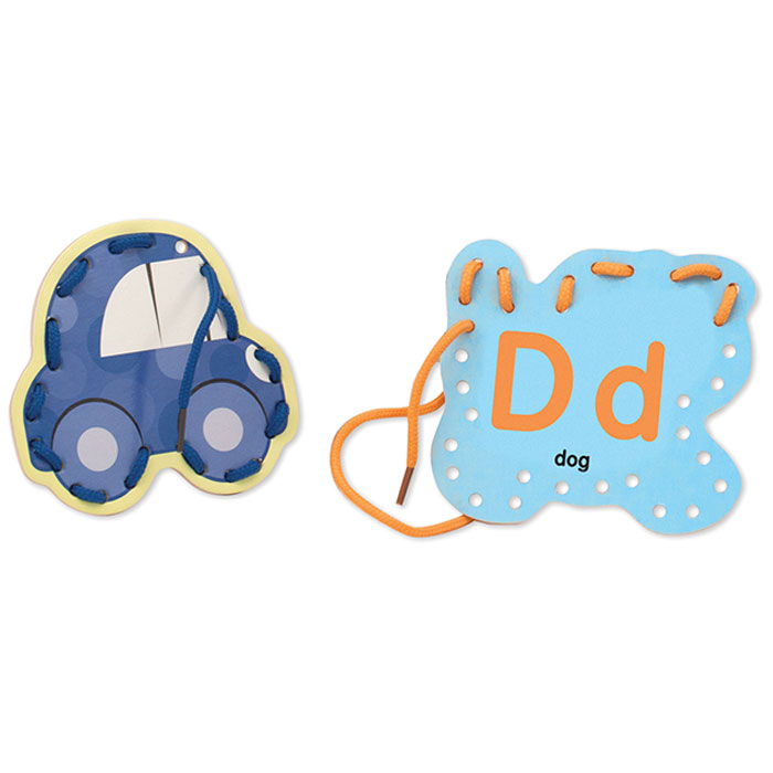 Start lacing! There's a shaped wood lacing board for every letter of the alphabet and 26 laces. The upper and lower case letters are printed on the back of each shape.