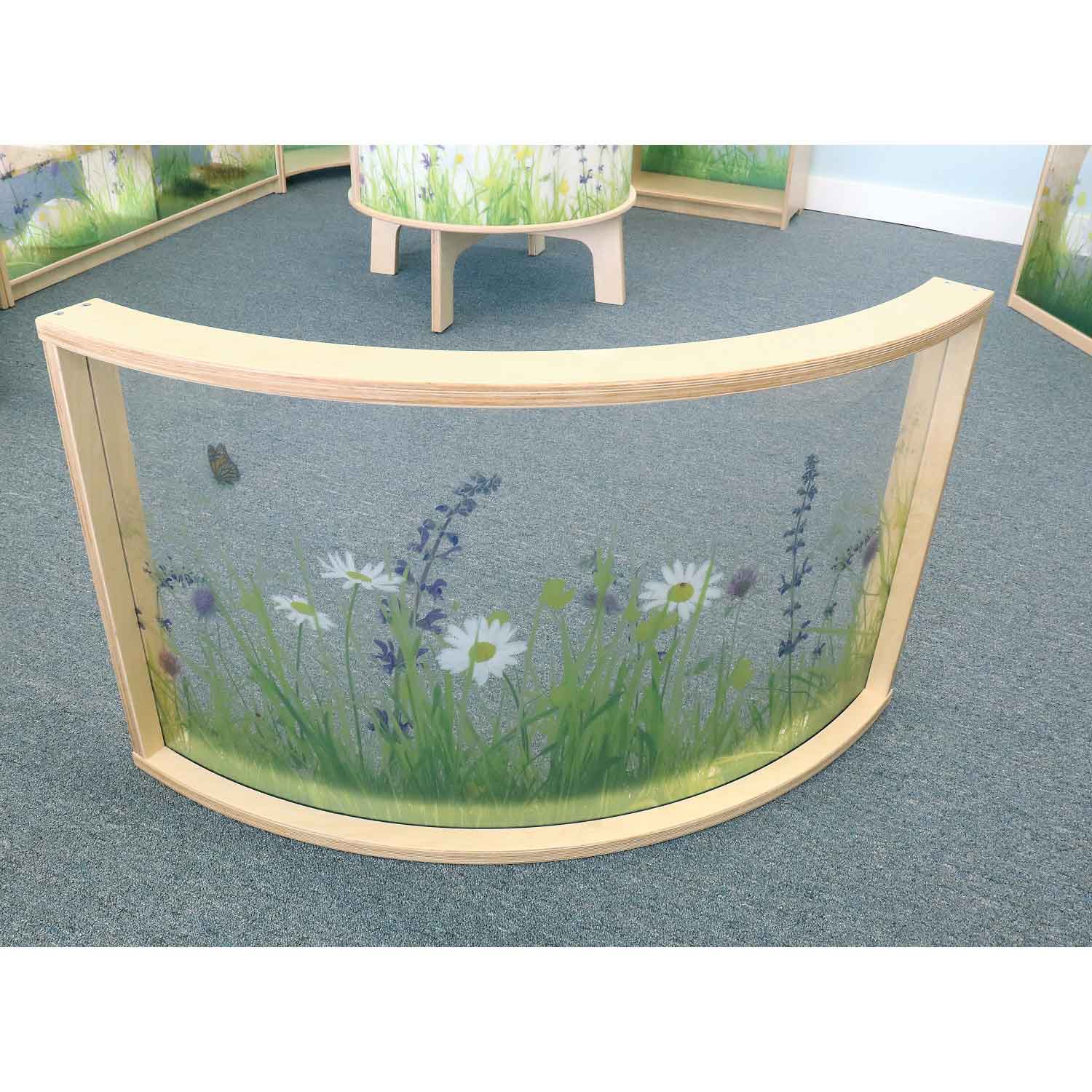 Create a unique nature-inspired toddler area! This room divider is a gracefully curved clear acrylic panel that softens corners and features an inviting nature scene that brightens and defines any room environment while providing maximum child visibility and supervision. Use the connector panel accessory [included] to connect the panel to other pieces in the Nature View Room Divider Collection [each sold separately] and create a flexible divided area layout in the warmth of wood and nature without unsightly plastic connectors. All corners and edges are rounded over and finished smooth for safety.