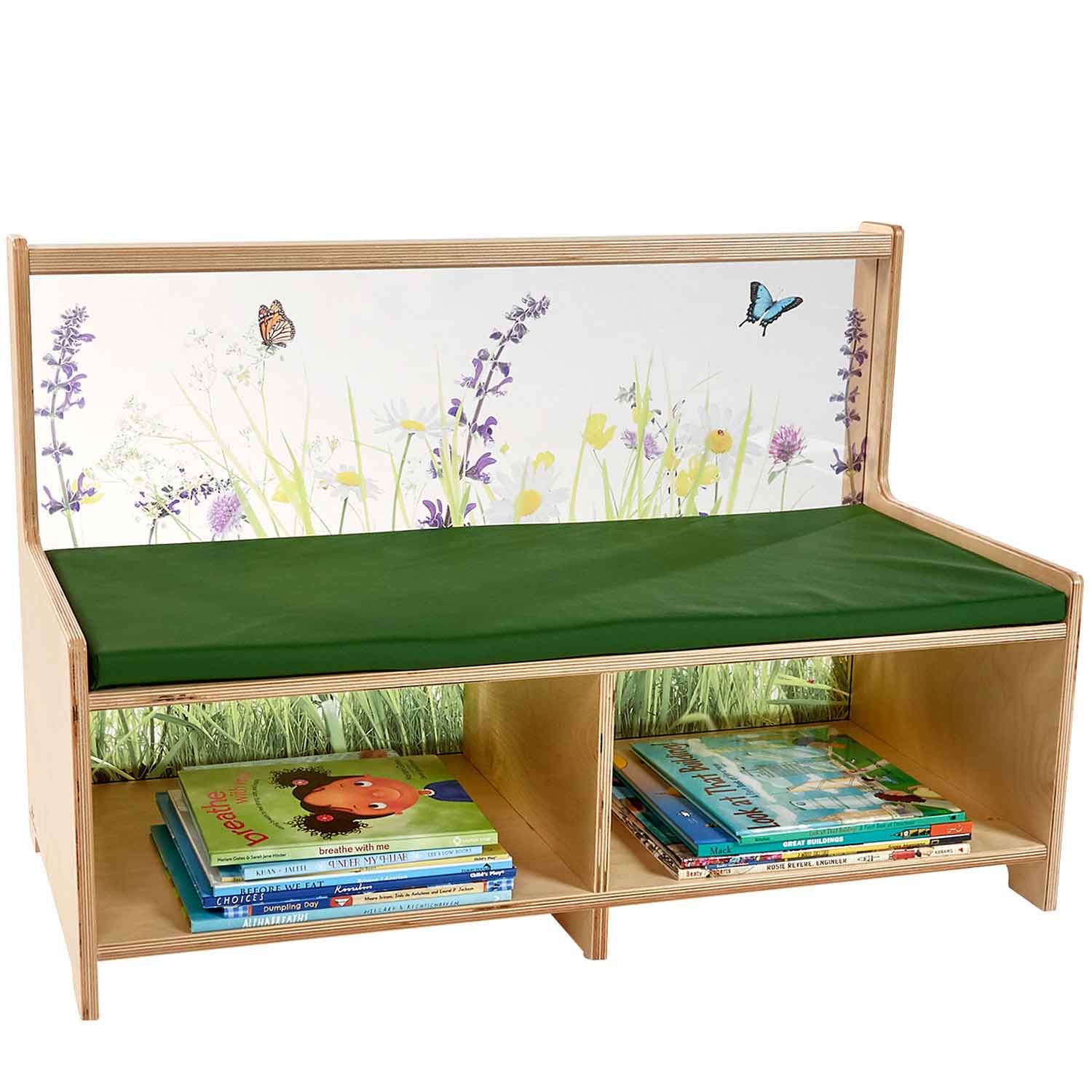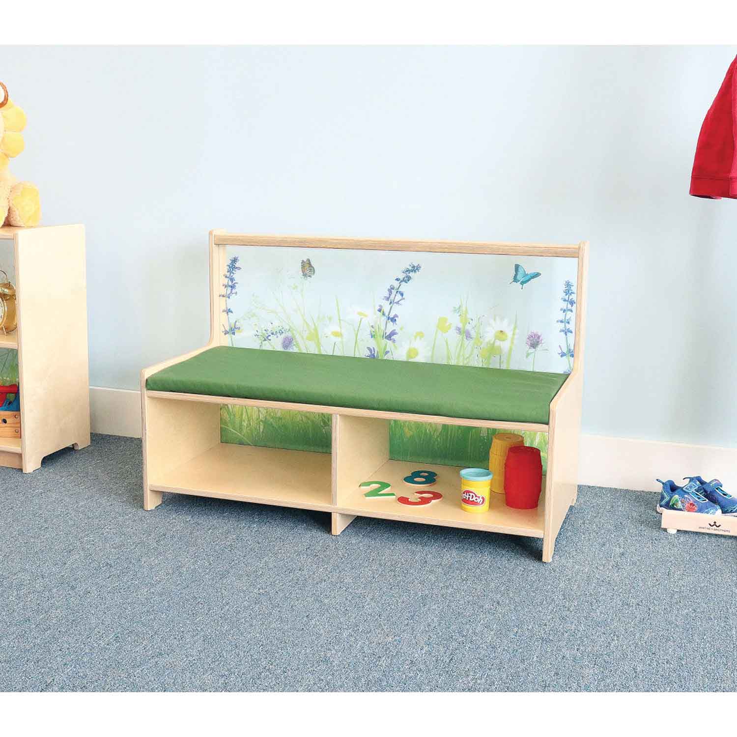 Create a flexible nature-inspired reading area! The sofa features an open compartment for book storage beneath the seat and an innovative back panel constructed in safe, shatterproof clear acrylic imprinted with an inviting nature scene that integrates with all other pieces in our exclusive Nature View collection. Combine with other Nature View Straight or Curved Sofas (each sold separately) to form a horseshoe, circle, S-shape or other inviting and flexible learning area that children will love! All corners and edges are rounded over and finished smooth for safety. A perfect solution for flexible classroom seating!