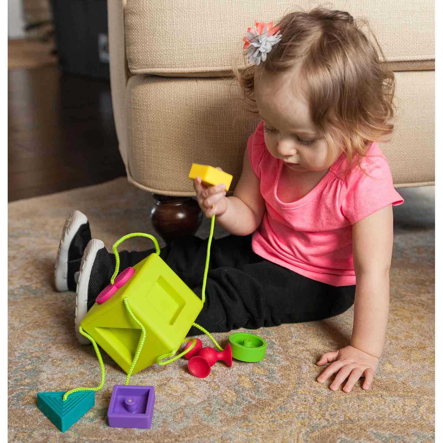 It's a shape sorter made from food-grade, soft and pliable silicone. The six textured shapes are safely tethered to the cube, so nothing gets lost or misplaced! Encourages fine motor skills, sensory learning, tactile exploration, visual-spatial skills.