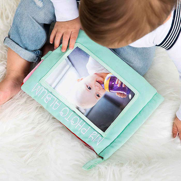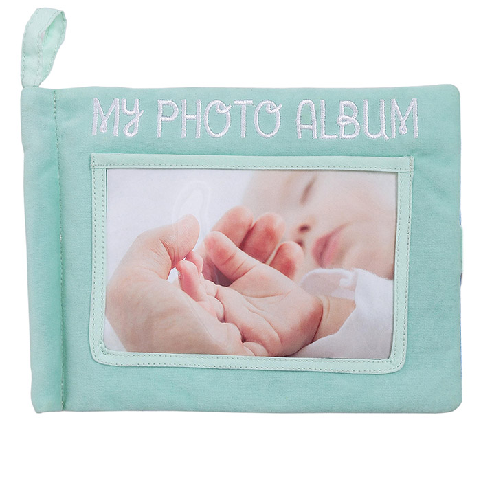 Perfect first book for infants. Soft photo book with four plastic sleeves to hold 4" x 6" photos of family members, animals, colorful images and much more.