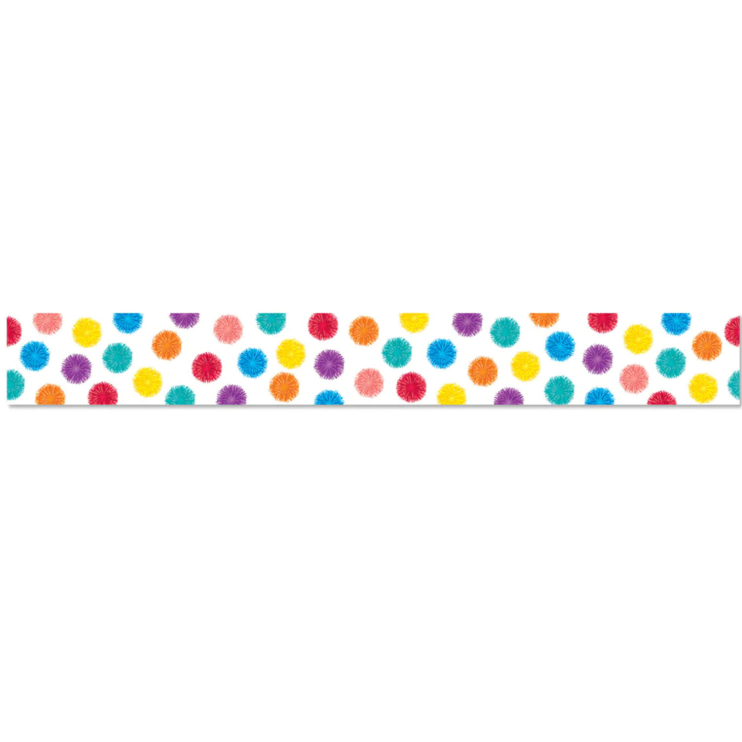 The Pom Dots EZ Border features a rainbow of colorful mini pom-poms on a white background. The cheerful rainbow-colored pom-pom dots are perfect for use on any bulletin board in the classroom.