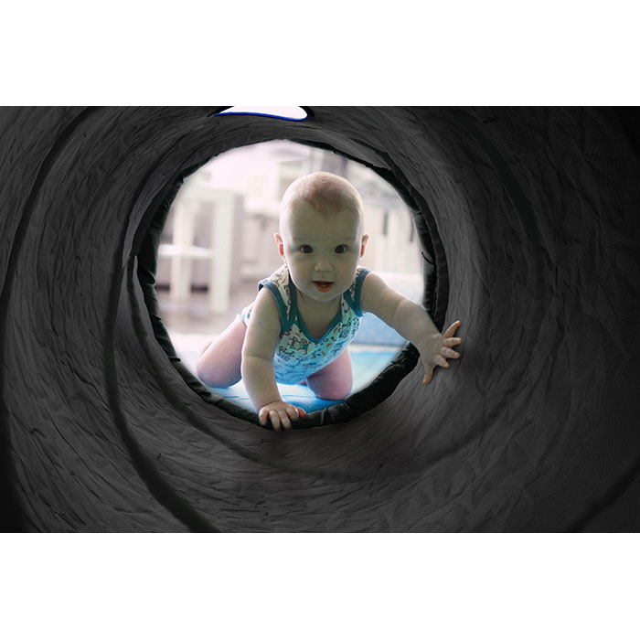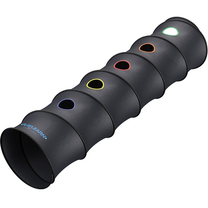 Made from safe and durable materials, this tunnel features kid-friendly construction with its round corners, durable stitching, and thick fabric with breathable mesh walls. Five color-coded holes at the top are designed for dropping objects through or for a child to move items in and out.