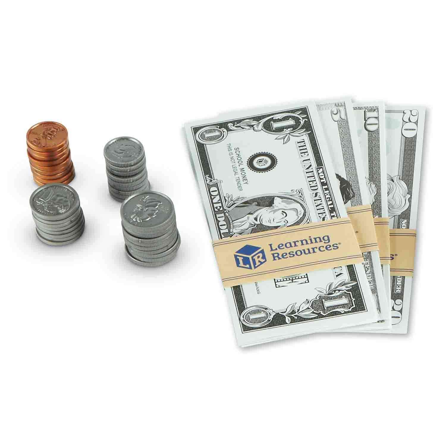 Teach coin and bill recognition, subtraction, addition, and calculation of correct change. Set of 150 includes actual-size bills and authentically detailed coins.