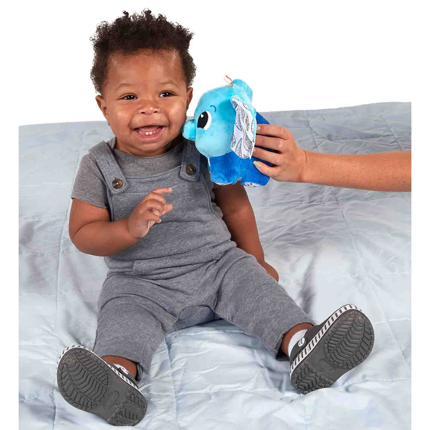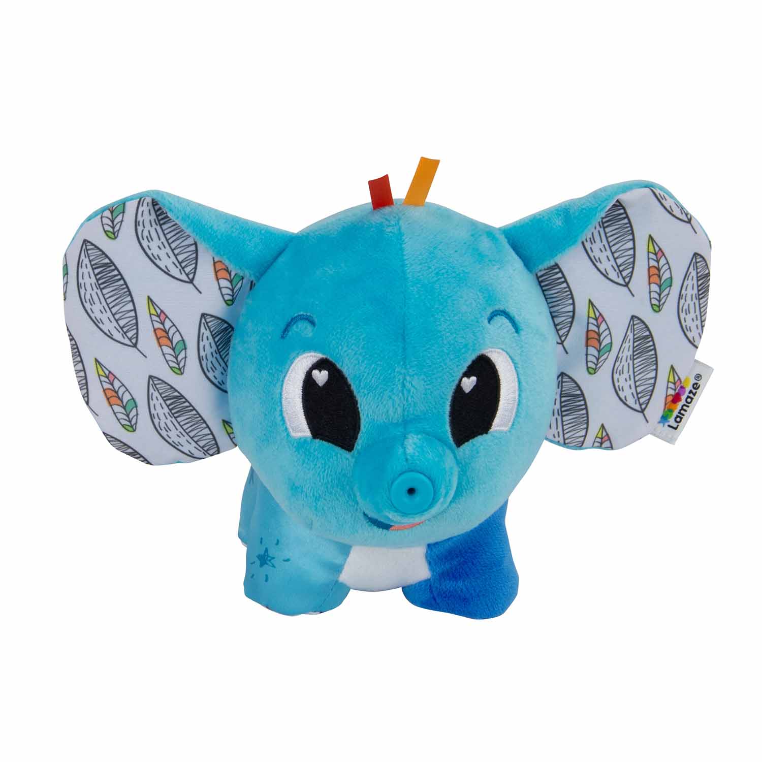 This plush elephant squeaks and blows a puff of air to help calm and soothe Crinkly ears add another sensory element.