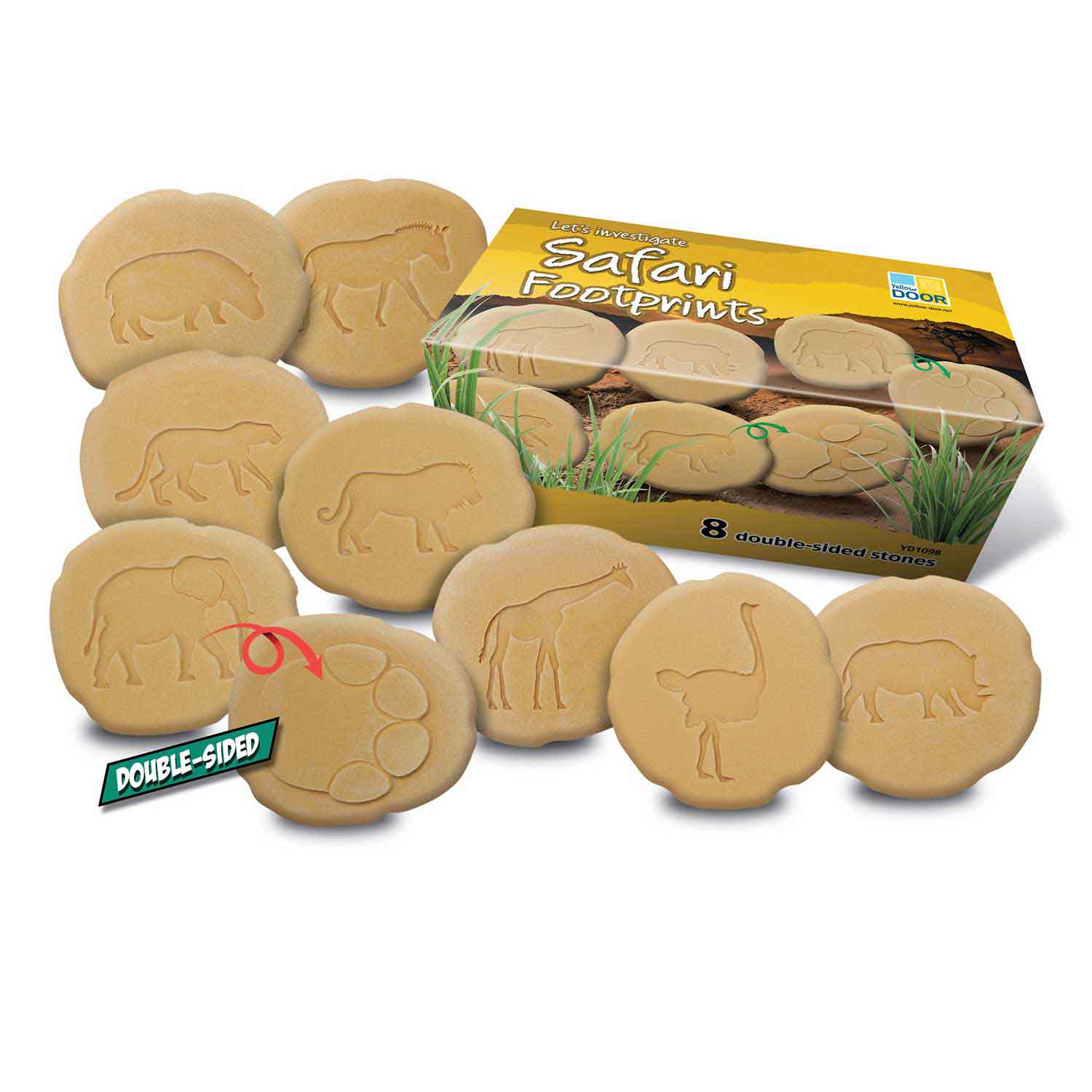 Take a walk on the wild side and explore what animals you might find on the African savanna as you follow their tracks. Each stone has a raised footprint on one side and the related creature in relief on the other. Watch out for the following animals: lion, elephant, rhinoceros, giraffe, hippopotamus, ostrich, cheetah and zebra. The footprint stones can be used in sand, water and soil, and are easily washed clean for a new adventure.
