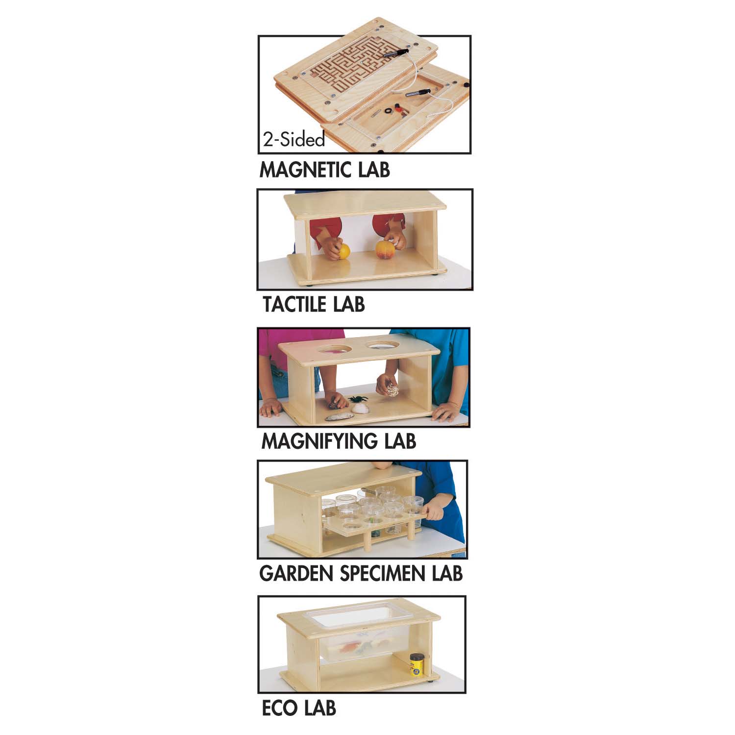 Build and explore with the Science Lab System. All labs store on the cart and are ready-to-use for instant science lessons. Six piece set includes Magnifying Lab, Tactile Lab, Garden Specimen Lab, Eco Lab, and the Science Lab Cart. Stackable.