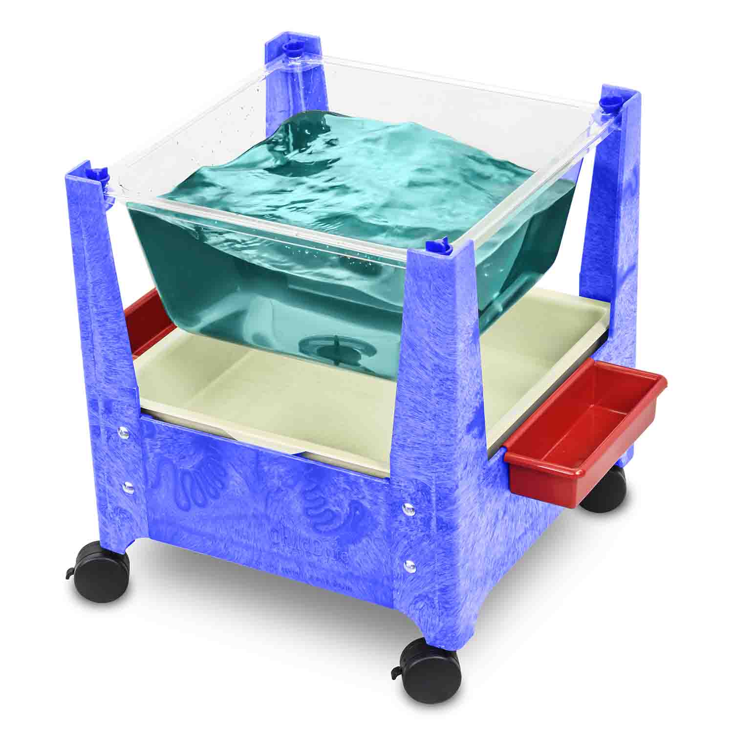 This space saver allows great visibility for all your sand & water activities. Features a 9" deep clear plastic tub with drain plug. Easily rolls indoors or out on four 3" locking casters. Includes two snap-on caddies, Mega-Tray, and white plastic lid.