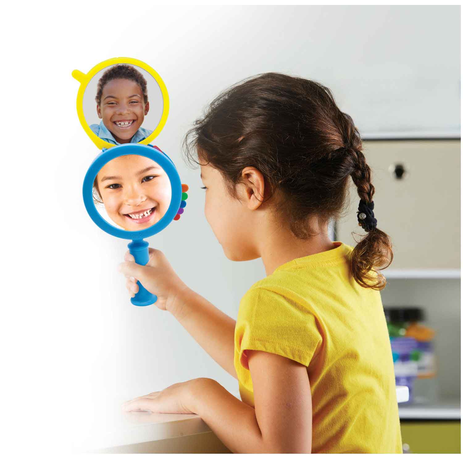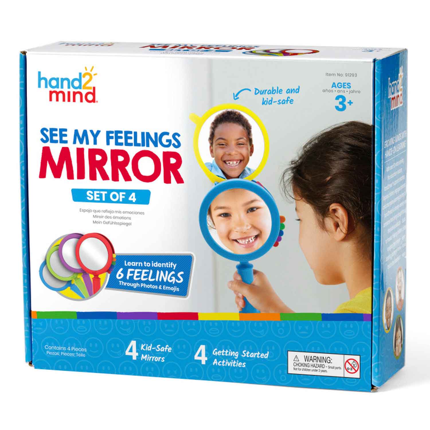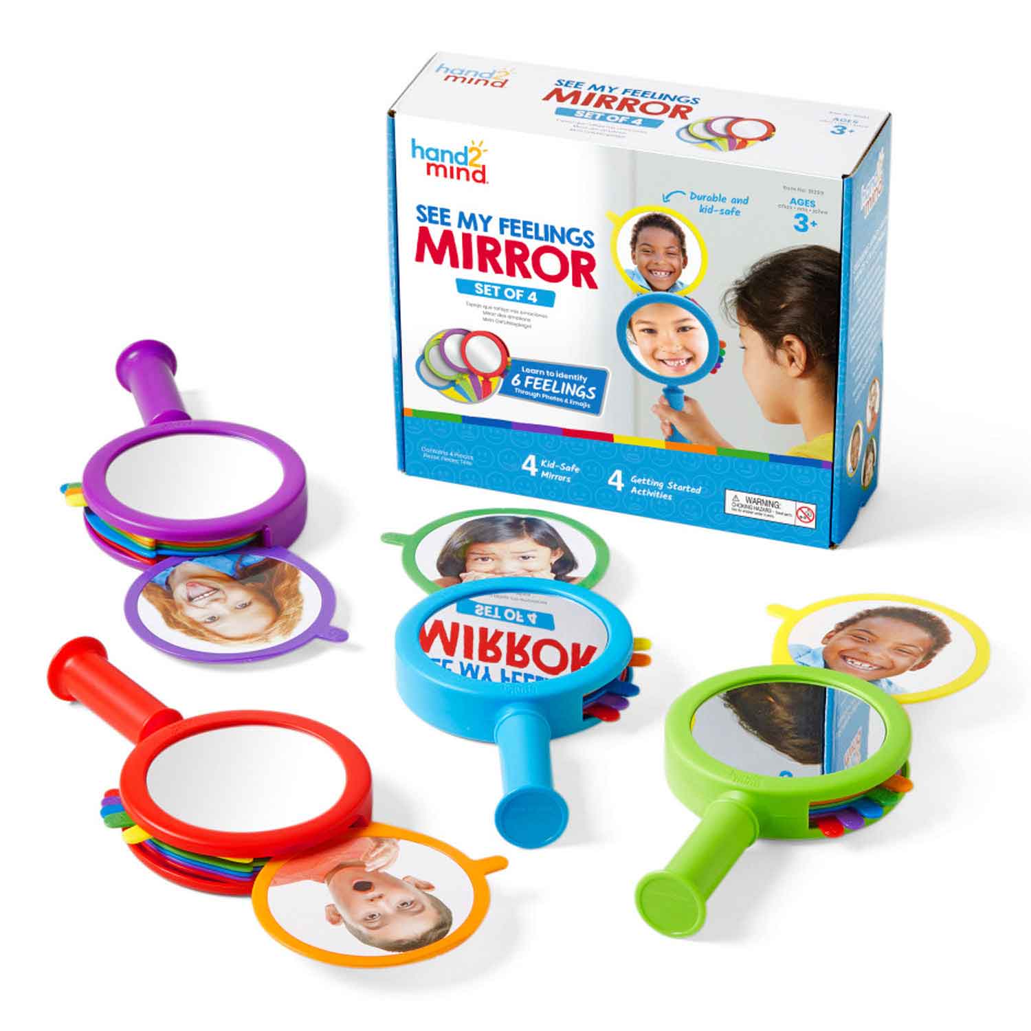 Help your students learn to label and identify their emotions. This shatterproof mirror makes learning and understanding feelings fun with 4 guided starter activities, easy-to-identify emojis, and 6 different snap-in-place emotion slides.