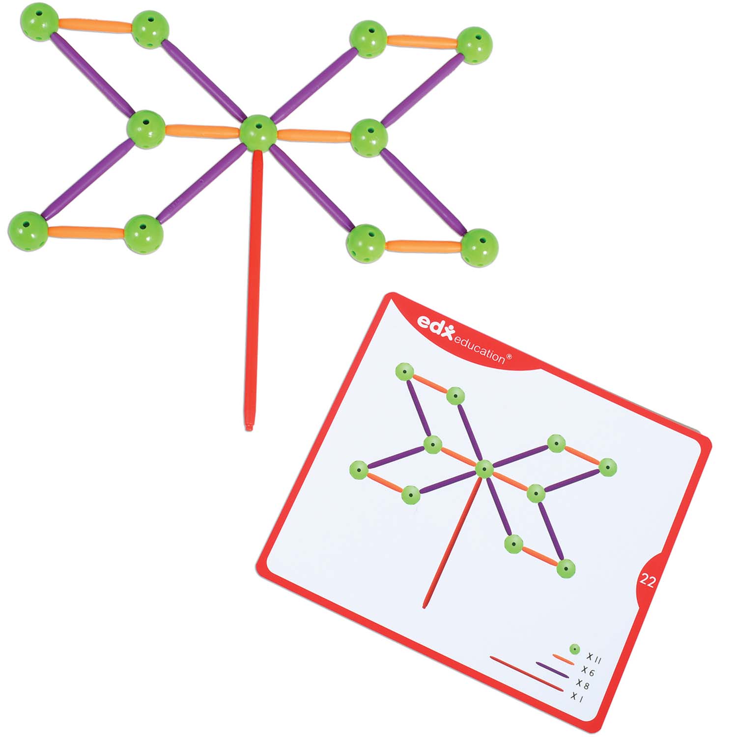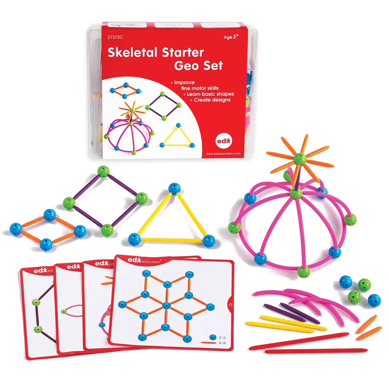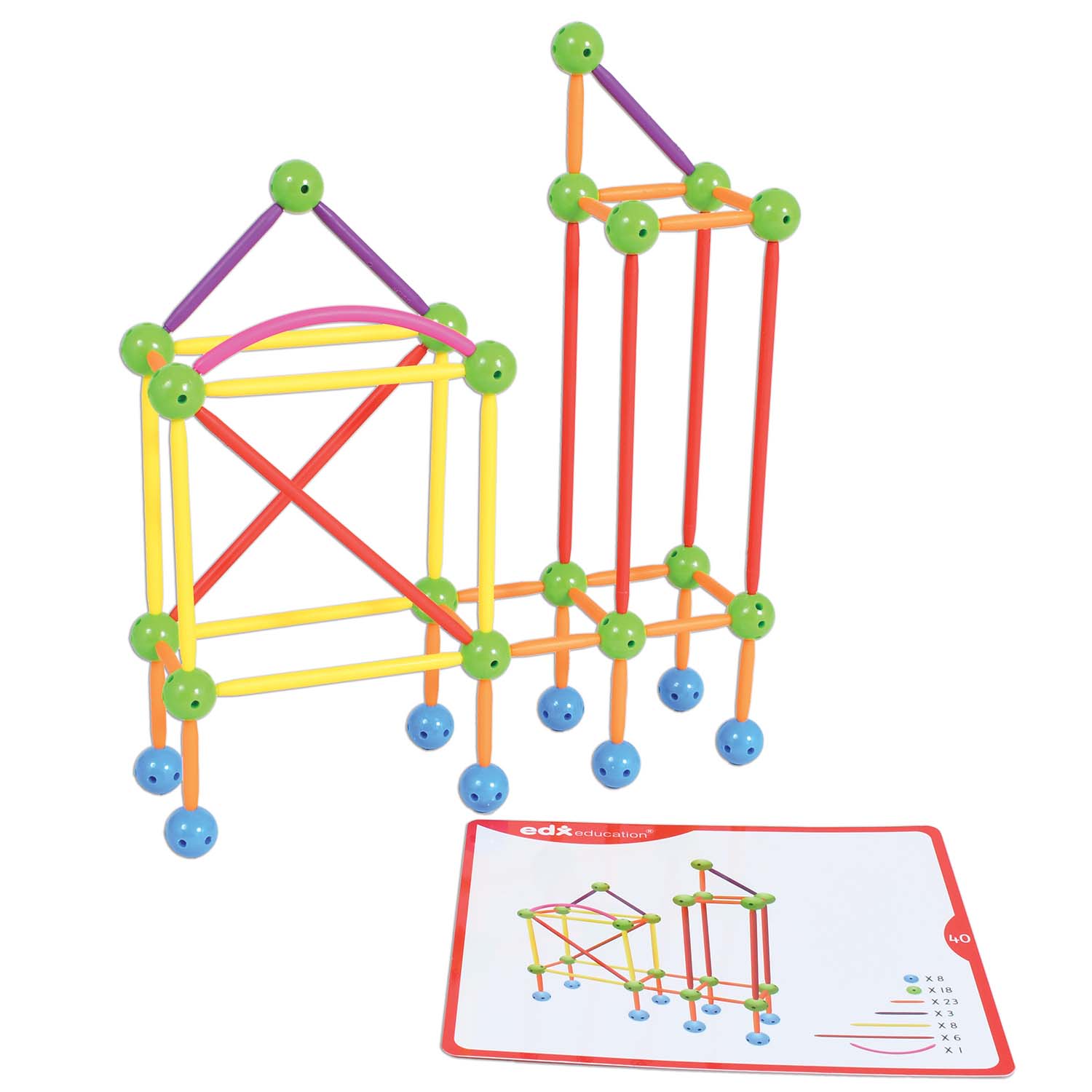 Skeletal Starter Geo Set is an introductory math manipulative for learning geometric shapes and having hands-on discovery of 2D and 3D geometry principles. This construction set will improve children's fine motor skills, as well as develop their creative and problem solving skills. Includes 20 double-sided activity cards that offer easy to more challenging building prompts.