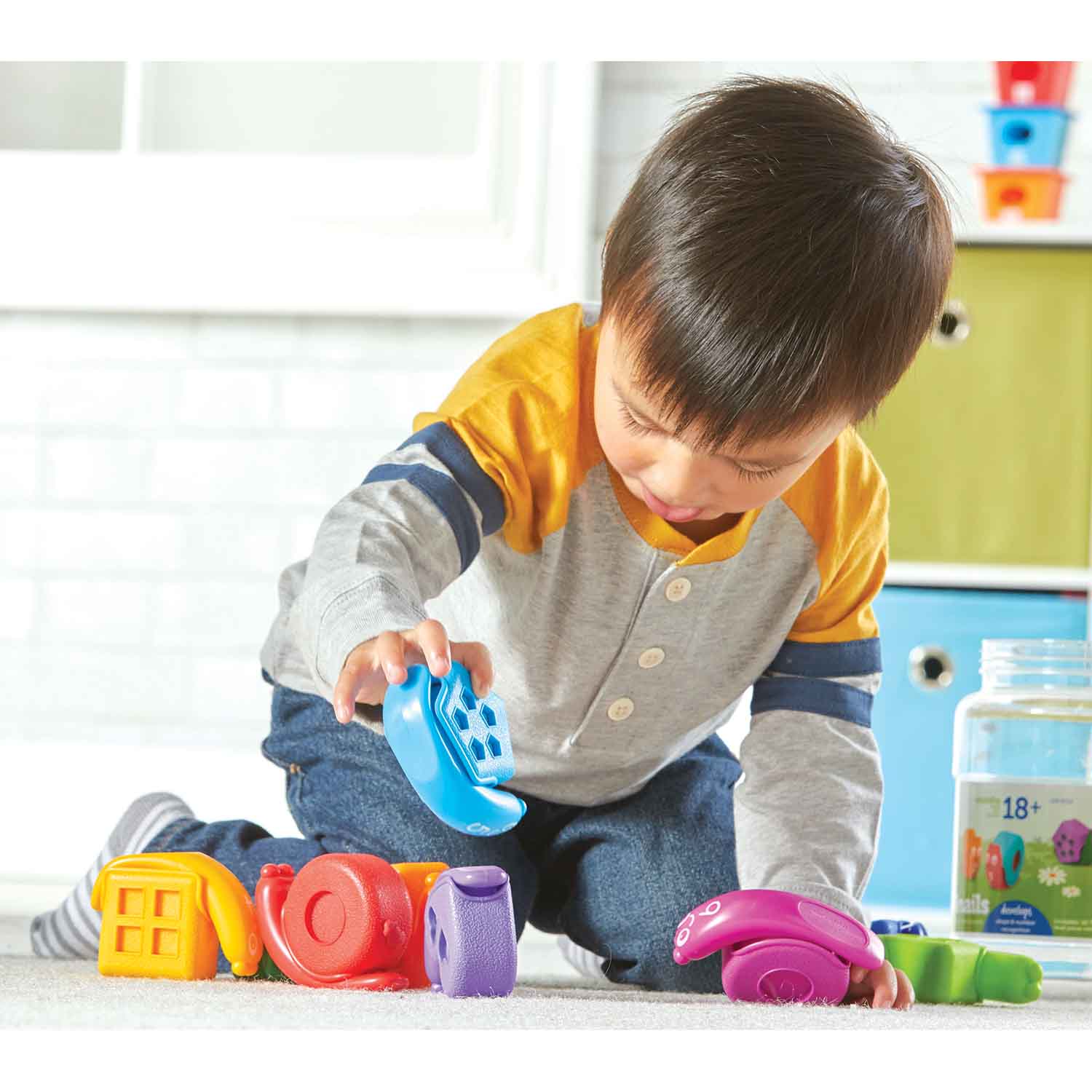 The Snap-n-Learn™ Snails carry a new load of skills right on their backs! These numbered snails, each with a removable shape shell, help each counting, color recognition and shape matching.