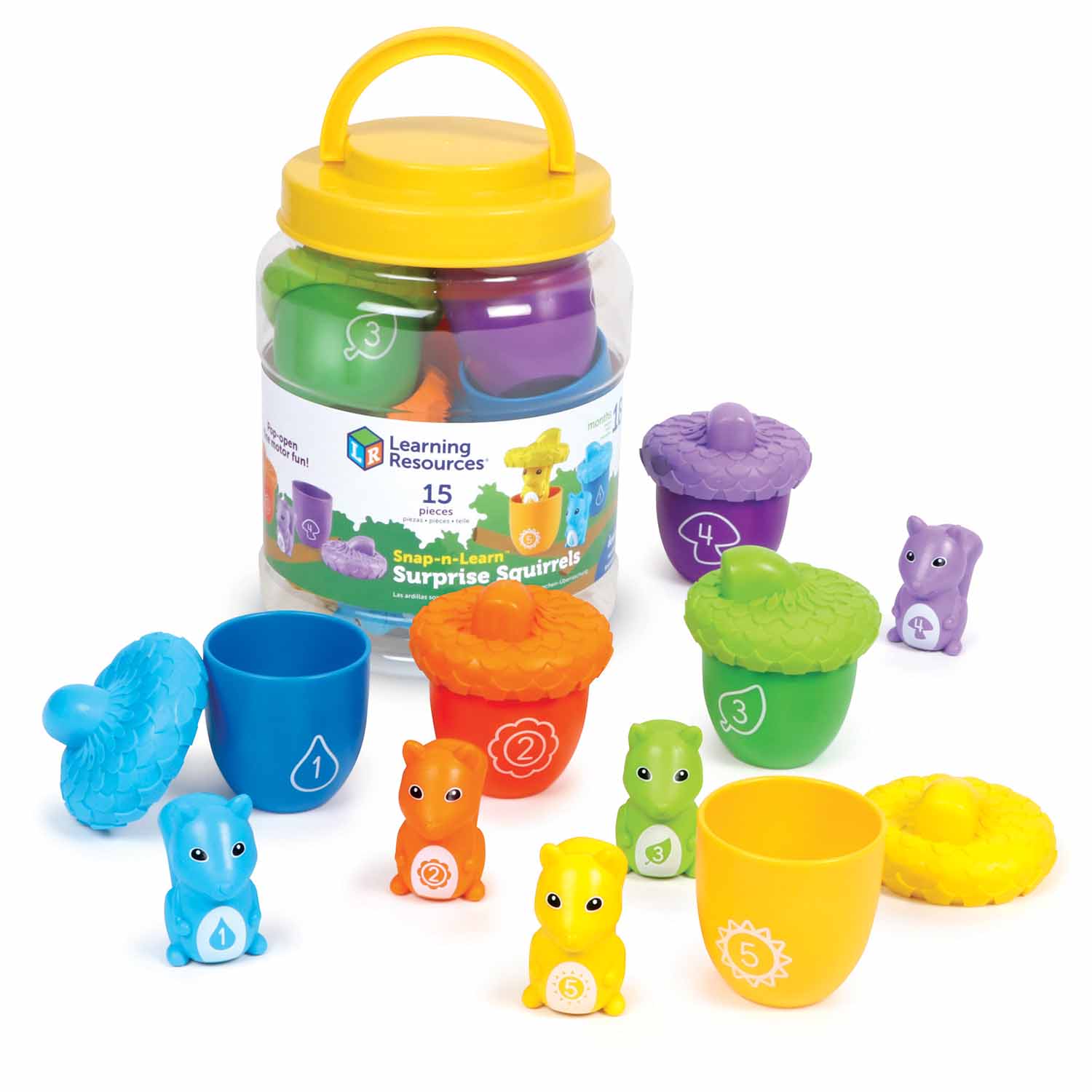 Pop open the textured acorns, discover the surprise squirrels, and start building shape, color, and number skills. Squirrels double as finger puppets!
