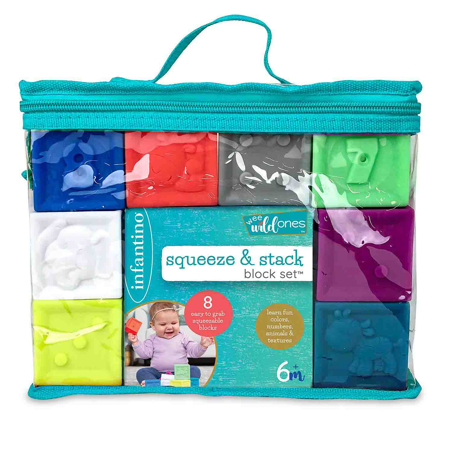 These soft, squeaker blocks have embossed pictures for sensory and language stimulation. Great for infant and toddler block play.