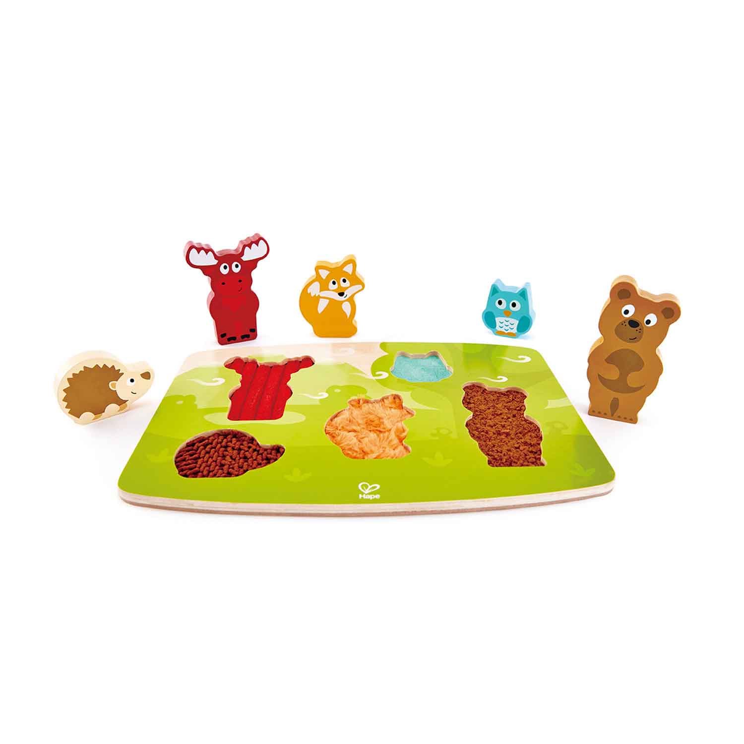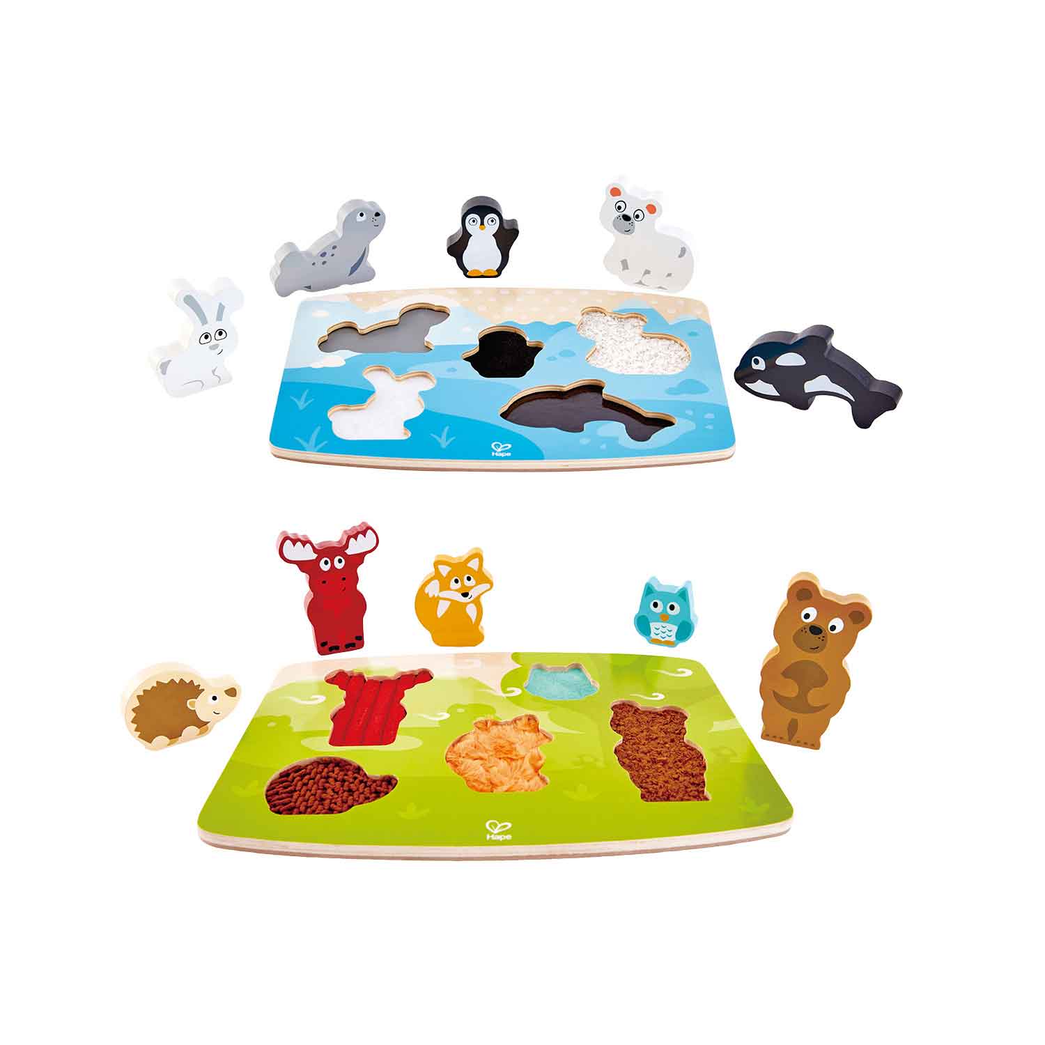 Remove the pieces of these tactile puzzles to feel the coats of each animal underneath. Includes a variety of popular forest and polar animals.