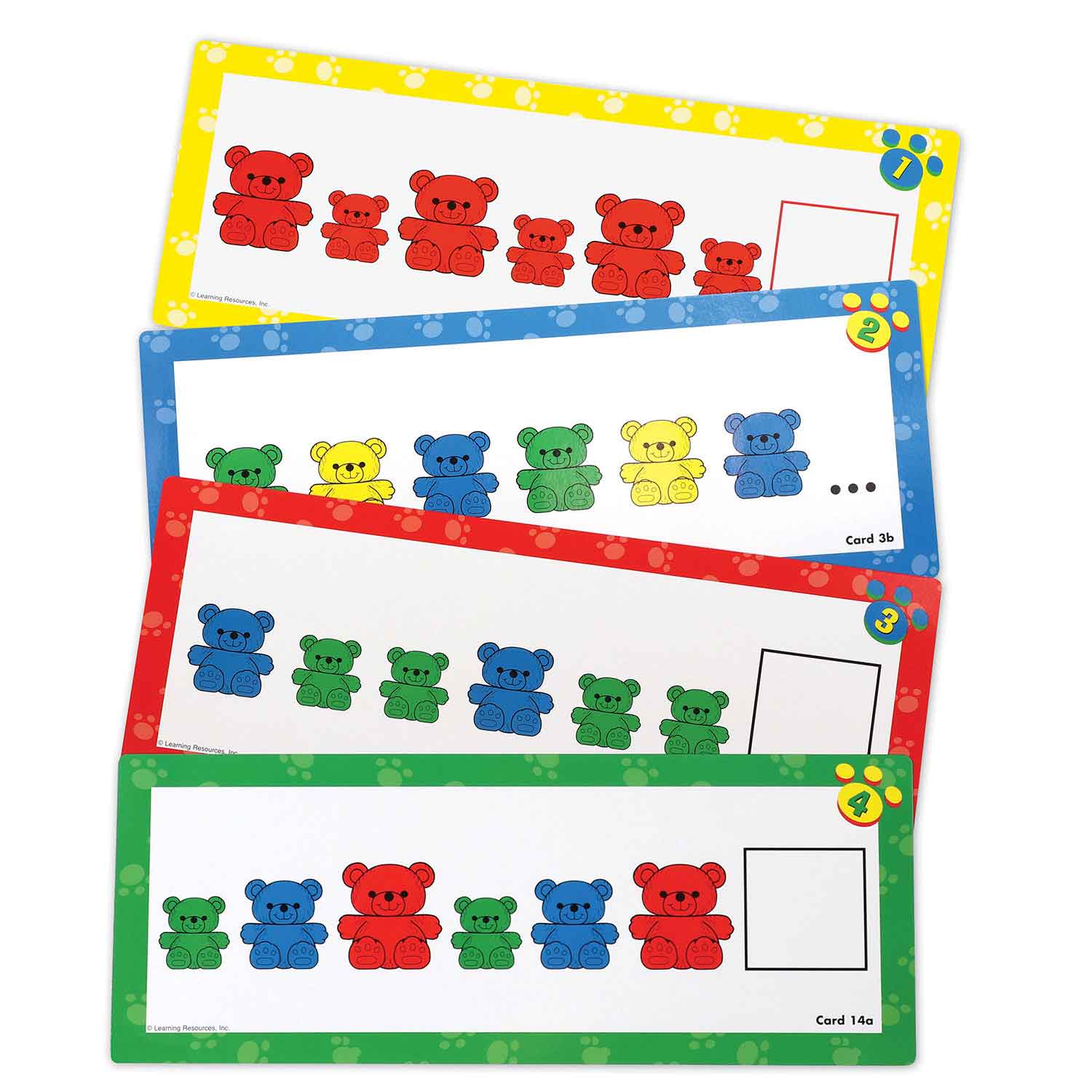 - Includes 96 Three Bear Family® counters in six colors, six sorting bowls, 2" color cube, number cube, 16 pattern cards, 12 double-sided activity cards and bear game spinner