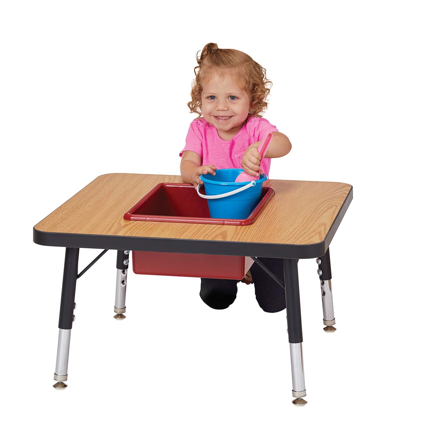 A sensory table at a toddler’s height. Laminate tabletop with KYDZTuff edges. Leg height adjusts from 15" - 24"H.