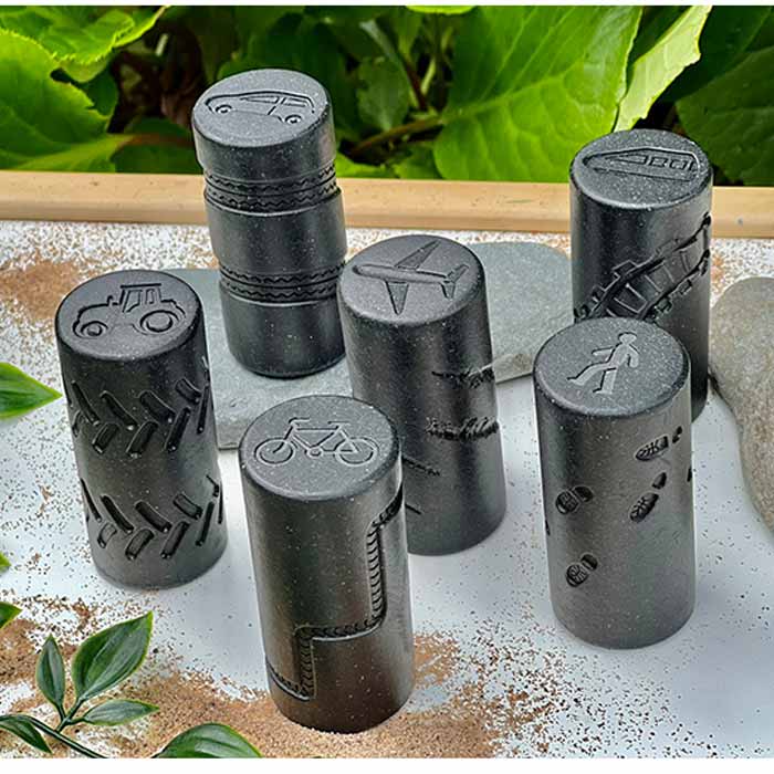 These dough rollers show the tracks made from a train, car, bicycle, plane, tractor and pedestrian. The stamper on the end of each roller has an image of the mode of transportation. Made of a durable stone mix that is easy to clean.