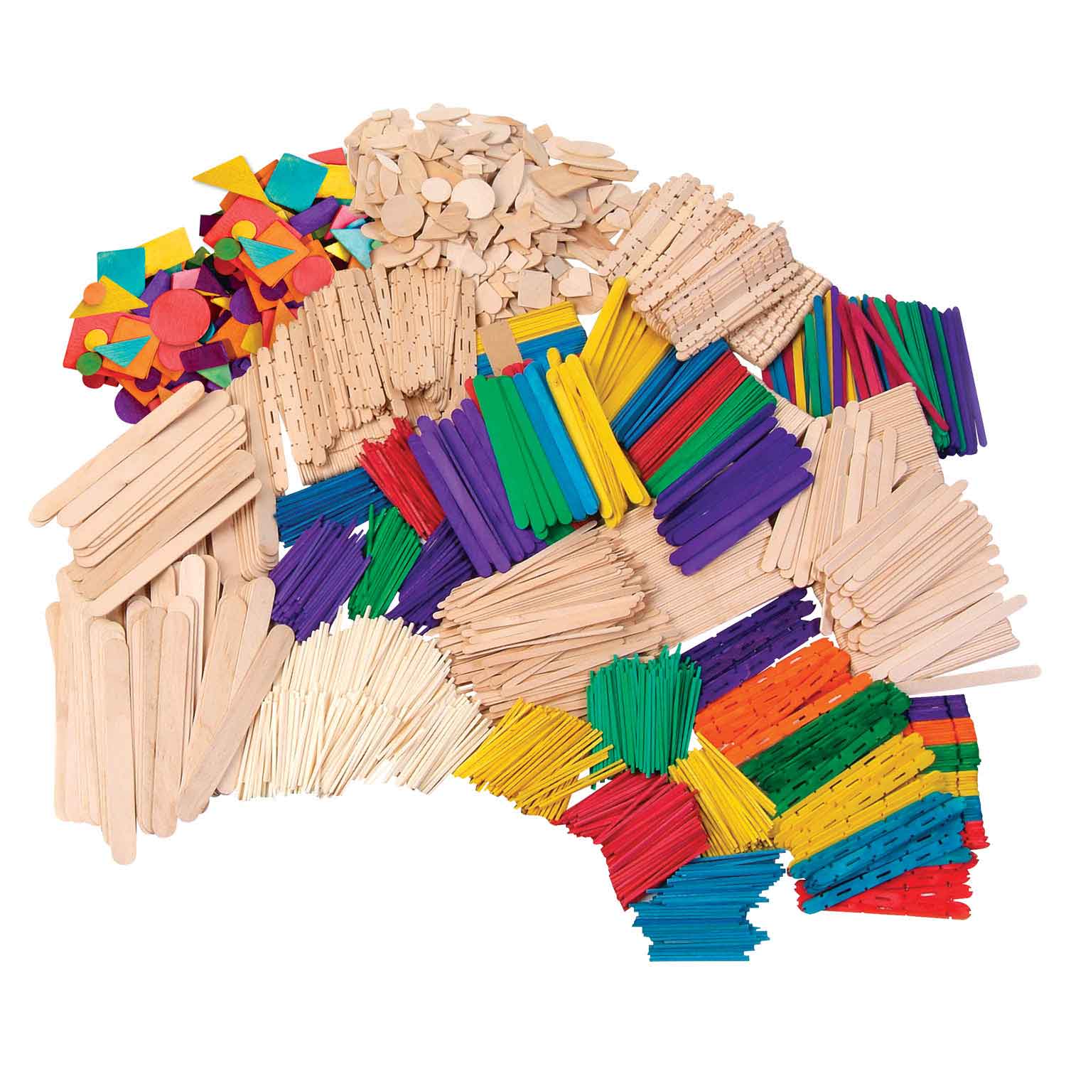 A terrific assortment of natural and multi-colored wood crafts including regular, jumbo, mini sticks, shapes, spoons, smart sticks, and building sticks. Includes an idea sheet.