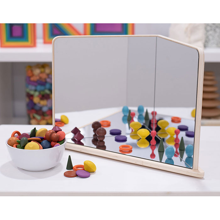 This 4-way mirror features a 90-degree corner where children can see reflections within each side and the base. The solid birch plywood construction provides a stable base for the 2mm acrylic mirrors, making the image flatter and clearer. Includes rubber feet to provide stability and protect work surfaces.