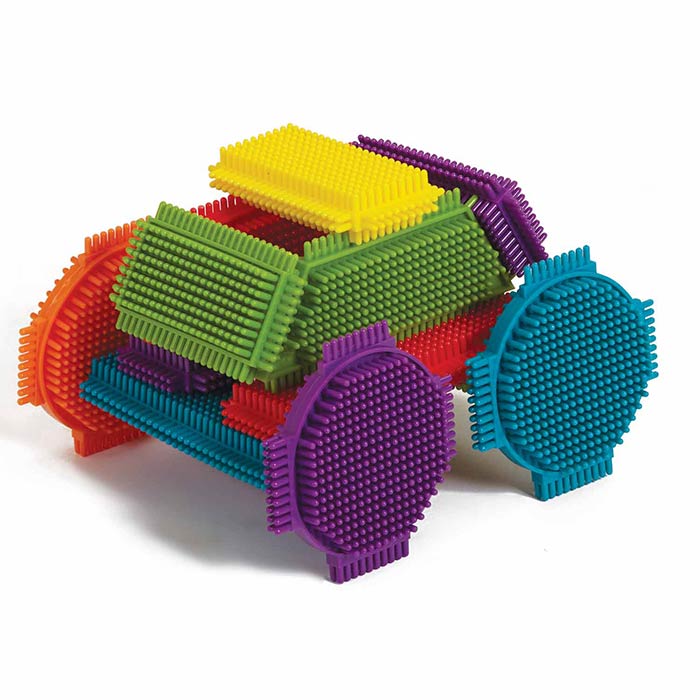 These soft and flexible bristle blocks come in nine different shapes. The brix easily interlock and are ideal for open-ended and constructive play. The set features oversized pieces designed for small hands to easily manipulate.